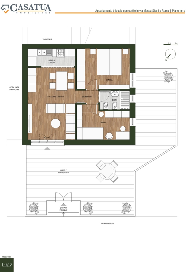 LOCALI e PIANO: Soggiorno, angolo cottura, camera matrimoniale, cameretta, bagno, corte esterna di proprietà, posto auto scoperto, T